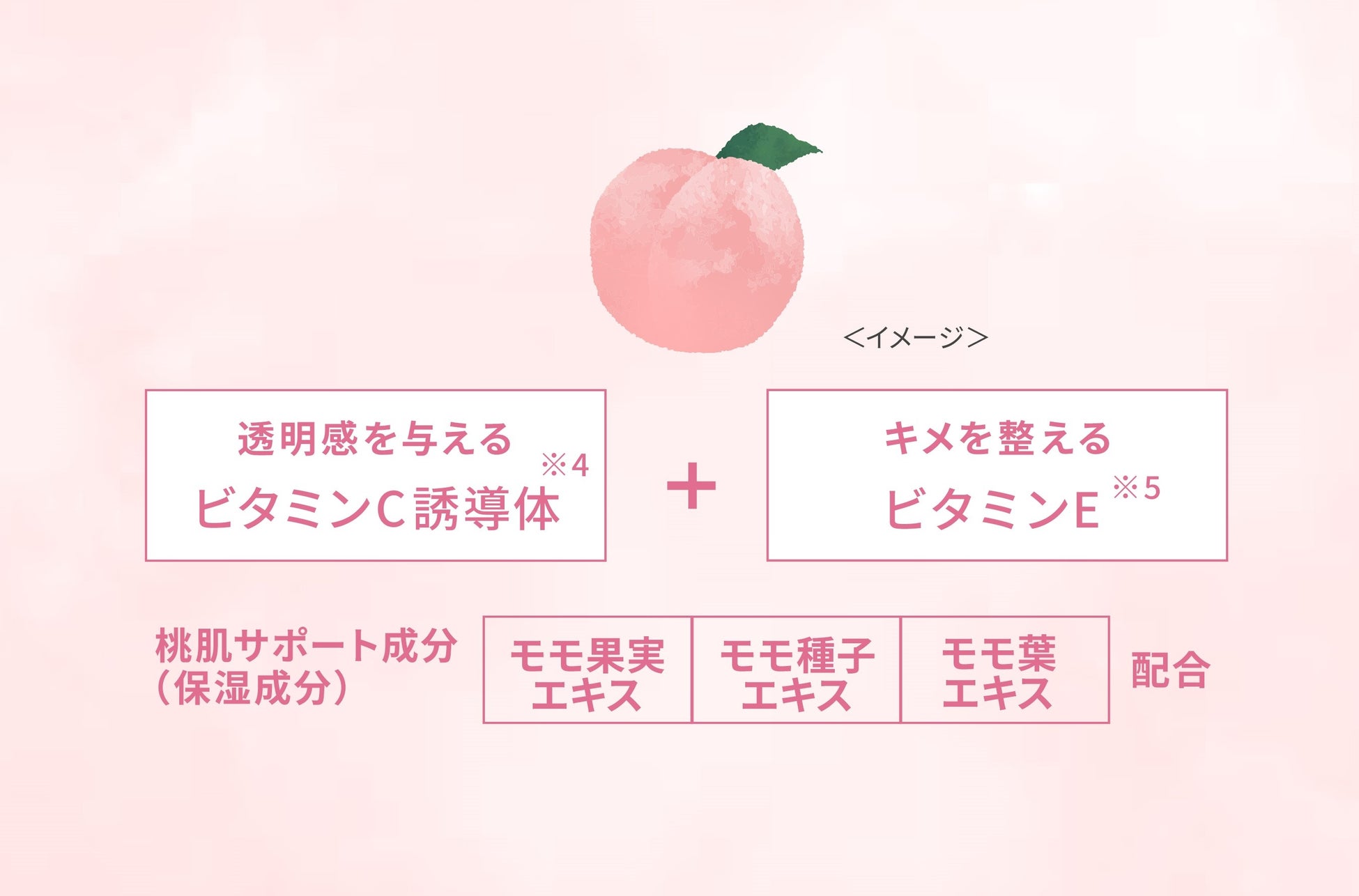 透明感を与える「ビタミンC誘導体※4」、キメを整える「ビタミンE※5」、「モモ果実エキス」、「モモ種子エキス」、「モモ葉エキス」を配合、しっとりもちもちの桃肌へ導きます。