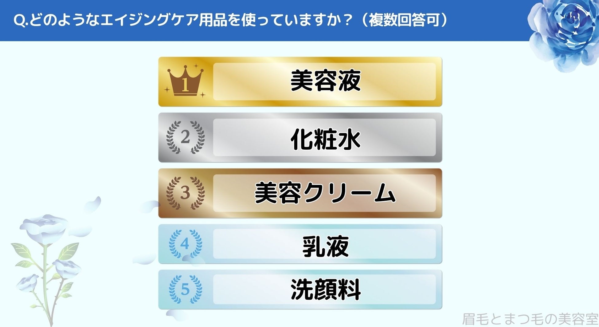 どのようなエイジングケア用品を使っているかお聞きしたところ「1位>美容液」、「2位>化粧水」、「3位>美容クリーム」、「4位>乳液」、「5位>洗顔料」という結果になりました。