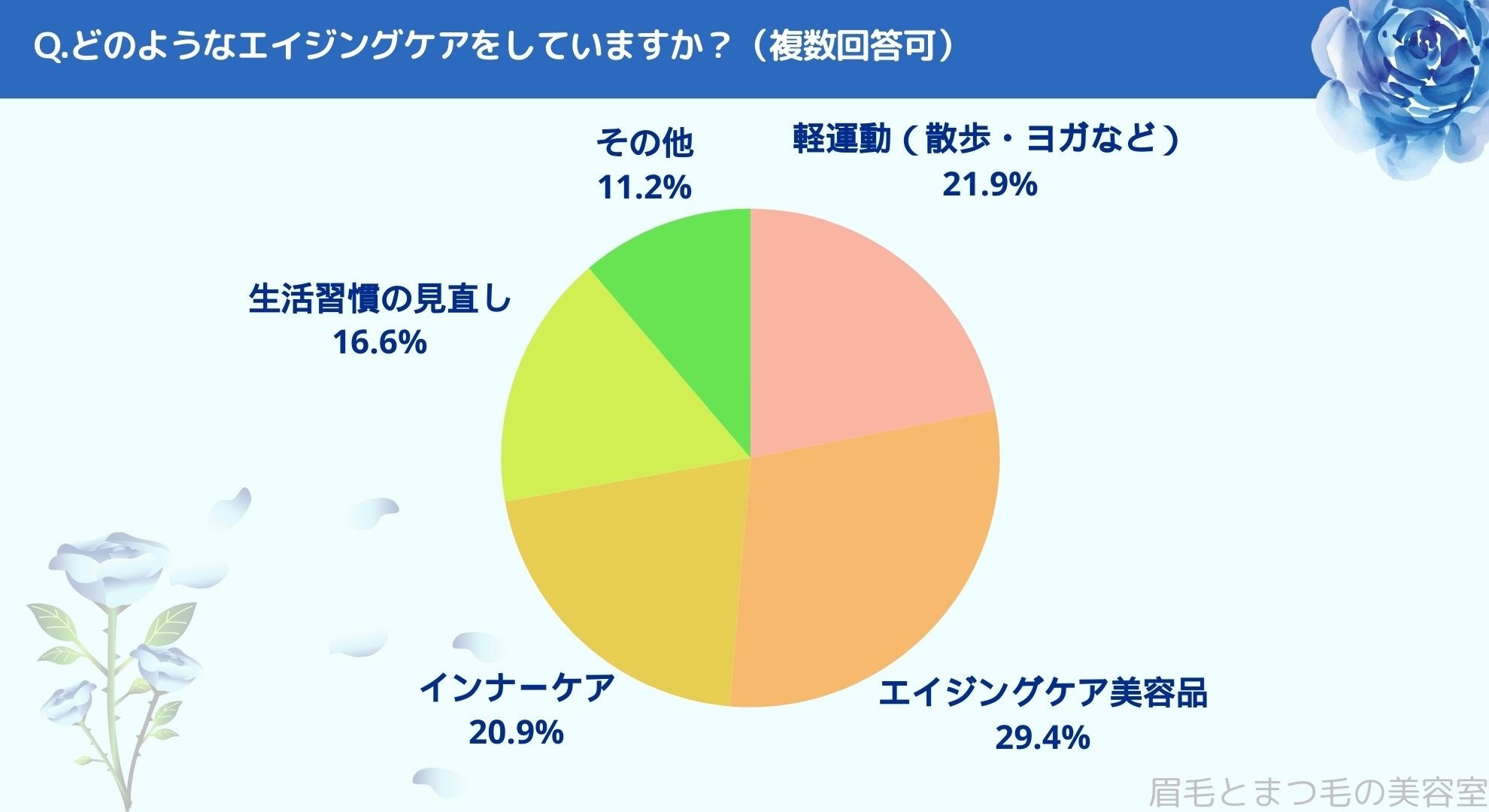 どのようなエイジングケアをしているかお聞きしたところ「軽運動(21.9%)」、「エイジングケア美容品(29.4%)」、「インナーケア(20.9%)」、「生活習慣の見直し(16.6%)」、「その他(11.2%)という結果になりました。
