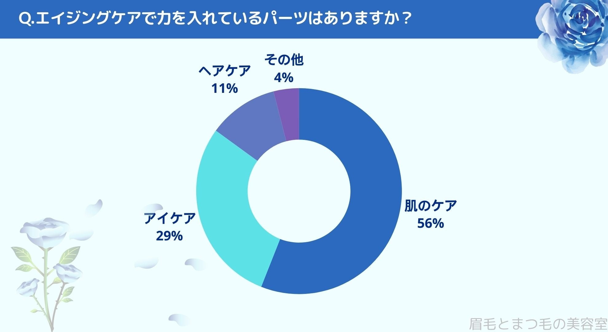 エイジングケアで力を入れているパーツをお聞きしたところ「肌のケア(56%)」、「アイケア(29%)」、「ヘアケア(11%)」、「その他(4%)」という結果になりました。