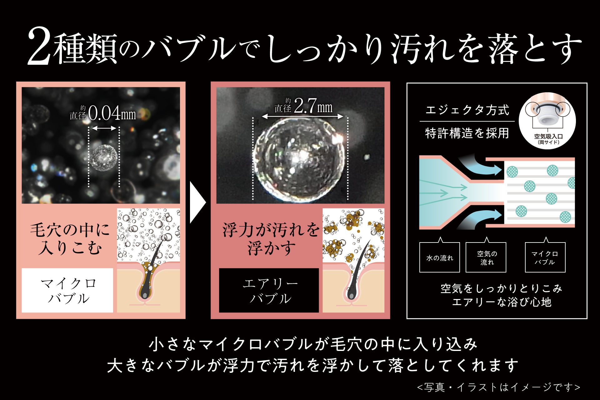 2つのサイズのバブルを同時に発生させることで、毛穴汚れと肌表面の汚れの両方にアプローチ。