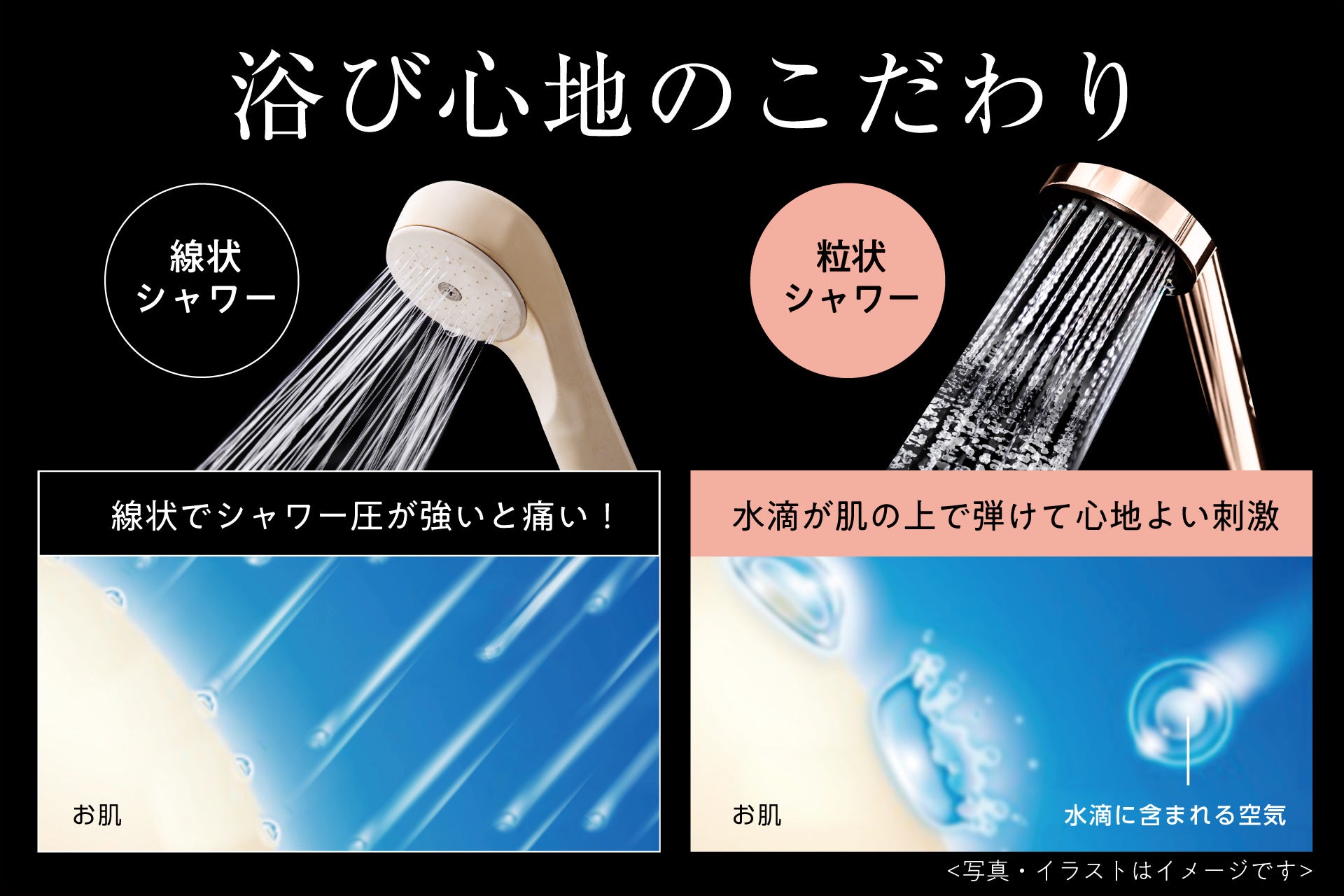 粒状シャワーで、まるで肌の上でスパークリングワインが弾けるような新感覚の浴び心地は、
