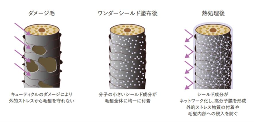 ワンダーシールドは、ドライヤーの前にさっとひと吹きするだけで独自の薄く強いシールド膜が髪に密着。熱を加えることにより、シールド成分をネットワーク化。毛髪表面を持続性の高い高分子膜でくまなく覆います。このメカニズムにより、髪を保護するだけではなく、サロンでのトリートメント効果を閉じ込めることができます。