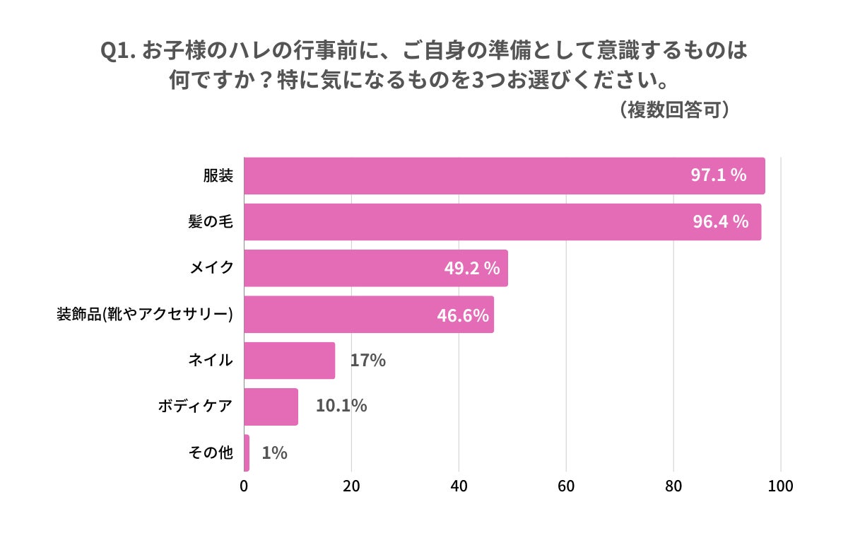Q1:子どものハレの行事を前に、ママが気にするおしゃれは「服装」「髪の毛」がダントツで95%超え