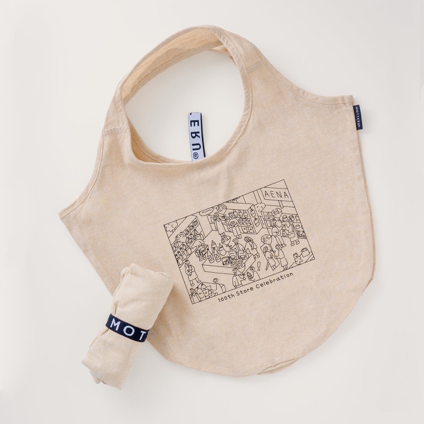 布地には環境にやさしい再生コットンを使用し、デザインにはアエナのビジョンマップをあしらいました。ゴムでくるっと丸めればコンパクトに持ち運ぶことが出来ます。