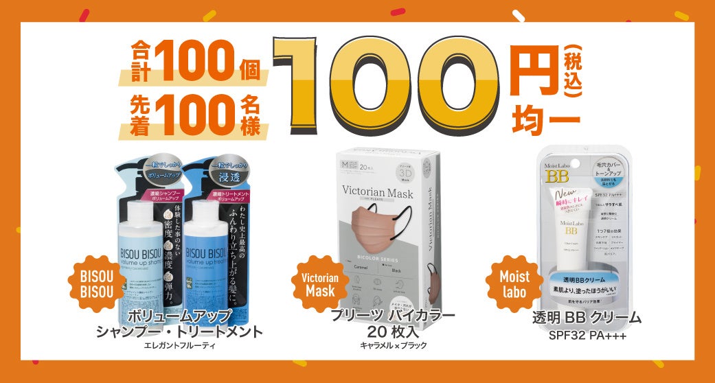• 【全店で開催】早い者勝ち!人気商品が1店舗あたり合計100個限定で税込100円均一に!