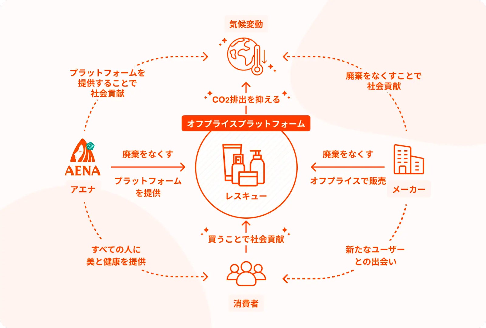 当社は、WOW!と出会える「アエナ」を実店舗およびECで展開しています。「アエナ」は、オフプライスのスキームを取り入れることによって、プチプラコスメや、韓国を含む海外コスメ、スキンケア商品を安価で販売し、廃棄ロスおよび所得層間の体験格差が生まれない社会の実現を目指して運営しています。