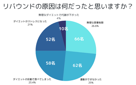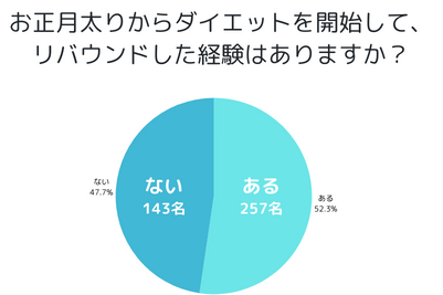 一方で、全体の52.3%(157名)がお正月太り後のダイエットからリバウンドしている。理由として「無理な食事制限だった」(22.6%/66名)「運動ができなかった」(20.6%/62名)「ダイエットがストレスになった」(19.3%/58名)などが挙げられる。