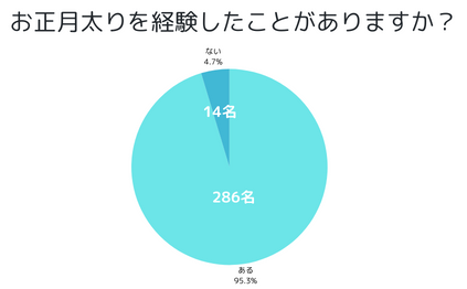 お正月太りを経験したことがある人は全体の95.3%(286名)。多くの人が年末年始で体重の増加を感じている。太りやすい食事内容になることが原因と考えている人が多く全体の79.3%(283名)を占める。