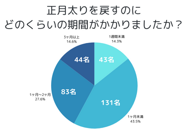 全体の87.7%(263名)の人が、短期間での正月太りの解消に成功している。最も多いのが1ヶ月未満で全体の43.6%(131名)、次いで1ヶ月〜2ヶ月で全体の27.6%(83名)。