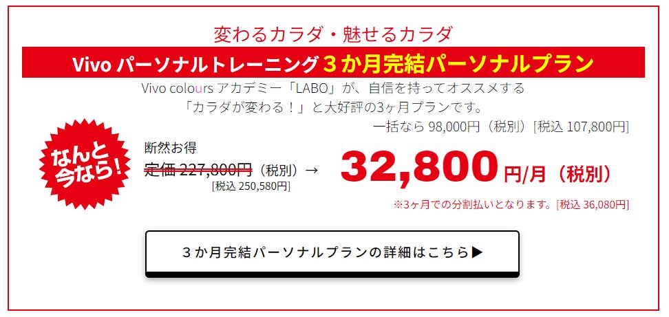 Wellness Colours Academy「Vivo LABO」(本社:兵庫県西宮市、代表:中瀨 敏和)は、スポーツクラブVivo、ホットヨガ・ピラティススタジオVivo Bearsi 各店でお得なトレーニングプラン『3ヶ月短期集中完結パック』を提供します。