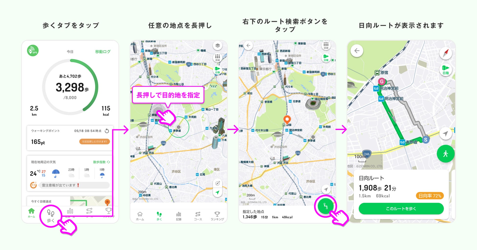 「日向ルート」は、現在地から目的地まで、日向を優先したルートを表示する機能です。ルートに占める日向率も表示されるため、ユーザーの選択の幅が広がります。