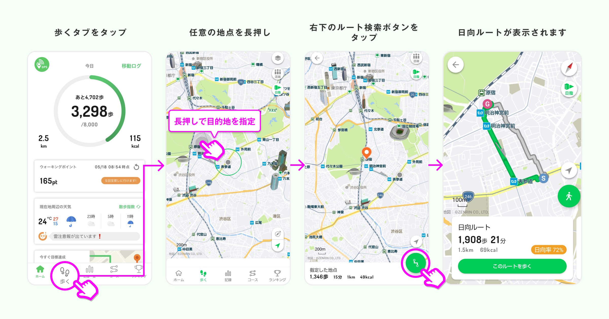 「日向ルート」は、現在地から目的地まで、日向を優先したルートを表示する機能です。ルートに占める日向率も表示されるため、ユーザーの選択の幅が広がります。