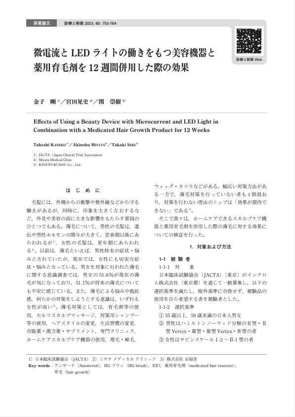 本試験は、微電流とLEDライトの働きをもつ美容機器と薬用育毛剤を12週間併用した際の効果を検証するもので、試験実施機関を一般財団法人日本臨床試験協会(JACTA)、試験総括責任医師をミヤタメディカルクリニック院長 宮田晃史医師に対応いただきました。