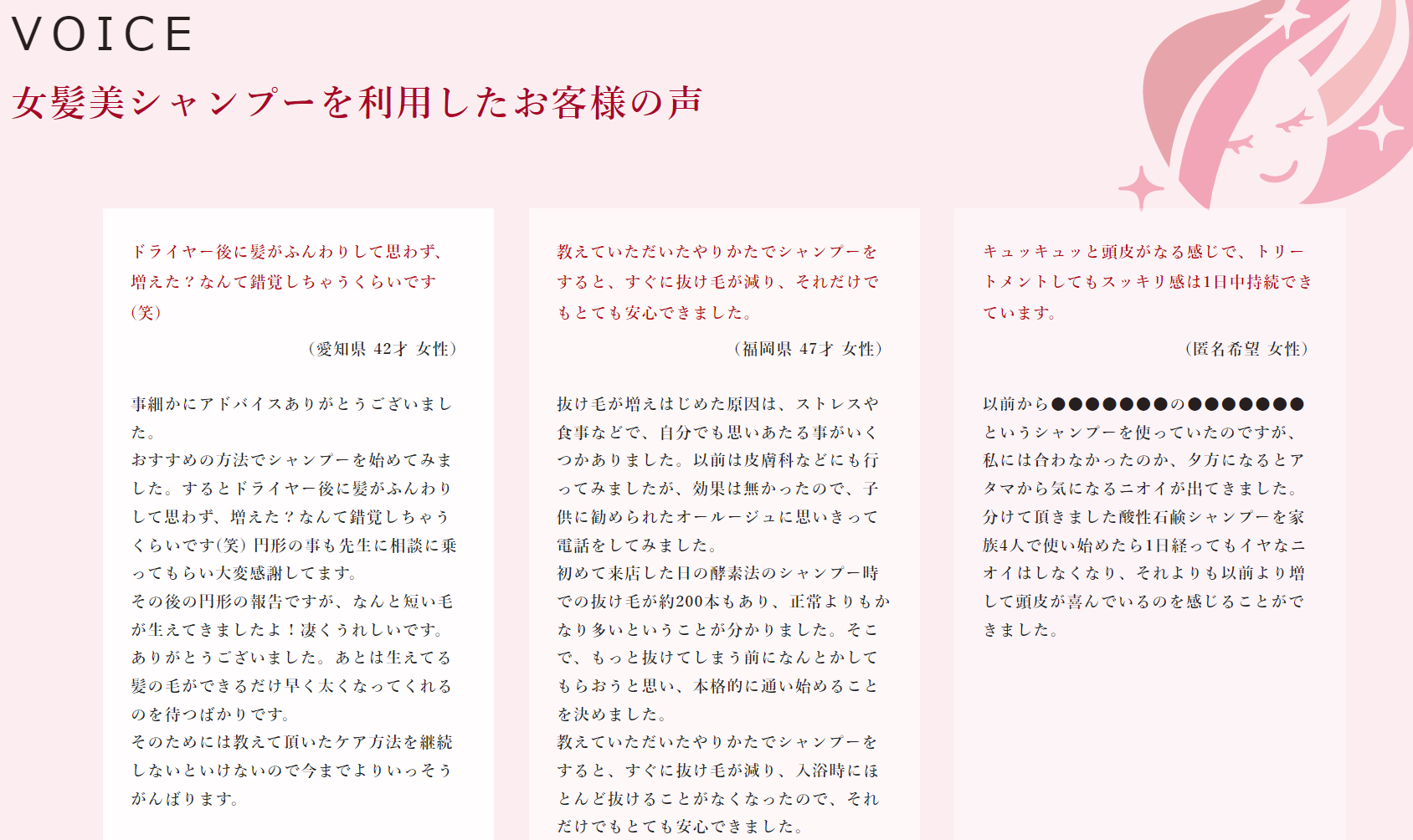 薄毛になる原因は、加齢や遺伝、食生活や生活習慣など様々な因果関係があるといわれています。 しかし、私自身が美容師として多くの方々の髪と頭皮を研究してきた結果、「洗髪」こそが薄毛の大きな原因であるということを突き止めました。逆をいえば、この「洗髪」を正すことで、豊かな髪を取り戻すことができる。 その信念を持って女髪美(めがみ)シリーズを生み出し、実際にご利用いただいたお客様からは大きな喜びのお声をいただいています。