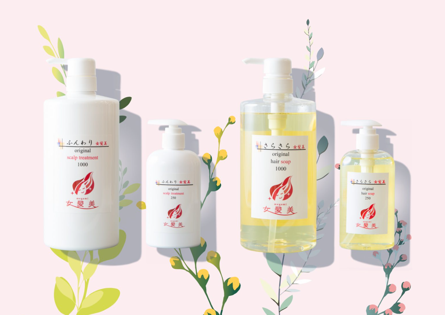 「女髪美(めがみ)」は頭皮洗浄に特化した、抜け毛・薄毛専門のシャンプーです。私が母の薄毛を治したい!という想いから研究開発をスタートました。