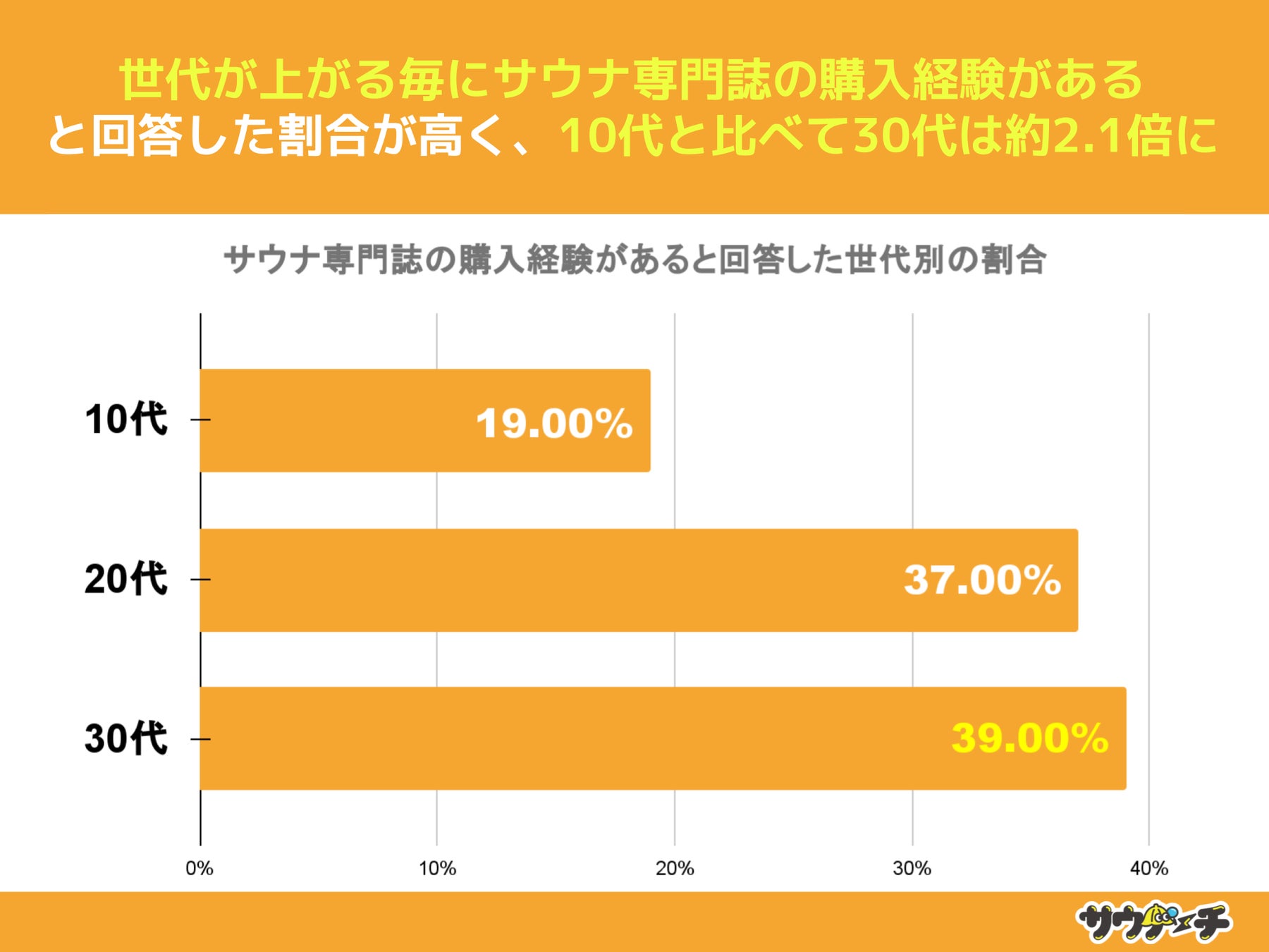 サウナ専門誌の購入経験があると回答した割合を世代別でみてみますと、30代の39%が最も高く、次いで20代の37%、10代が19%で、10代と比べて30代は約2.1倍高い結果となりました。