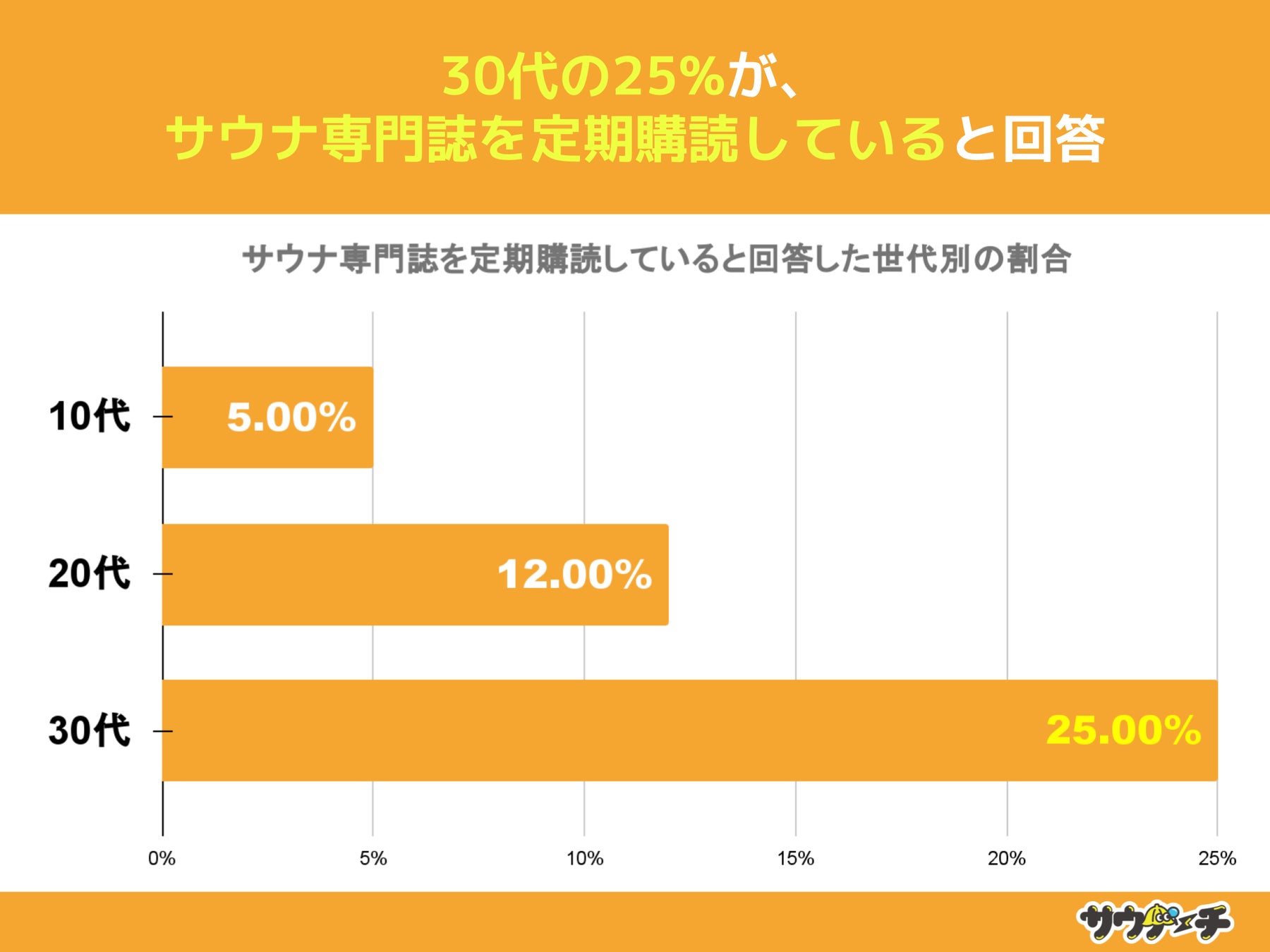 また、サウナ専門誌を定期購読していると回答した割合を世代別でみてみますと、30代の25%が最も高く、次いで20代の12%、10代が5%で、10代と比べて30代は5倍高い結果となりました。