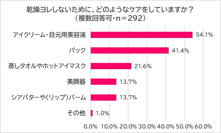 それでは、「どのようなケアをしているか?」尋ねたところ、「アイクリーム・目元用美容液」(54.1%)が最多で、「パック」(41.4%)も目立ちました。