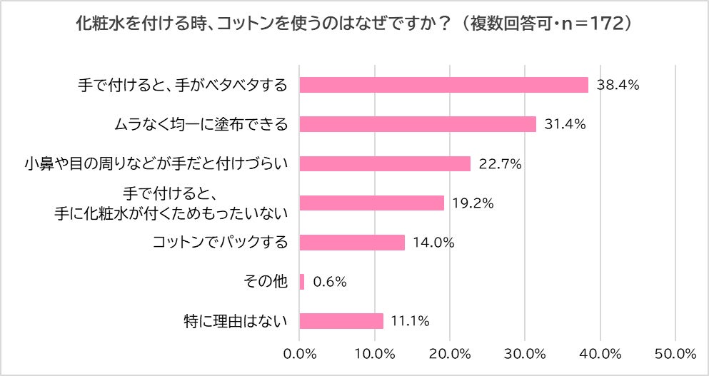 「化粧品はコットンで付ける」と回答した172人に「なぜコットンで付けるのか?」尋ねました。最も多かった理由は「手で付けると、手がベタベタする」(38.4%)となり、「ムラなく均一に塗布できる」(31.4%)、「小鼻や目の周りなどが手だと付けづらい」(22.7%)、「手で付けると、手に化粧水が付くためもったいない」(19.2%)と続きました。