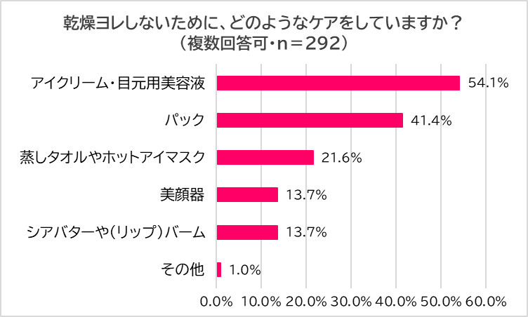 それでは、「どのようなケアをしているか?」尋ねたところ、「アイクリーム・目元用美容液」(54.1%)が最多で、「パック」(41.4%)も目立ちました。