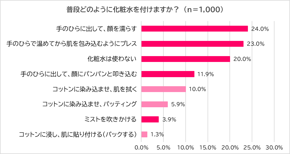 実際、「どのように普段化粧水をつけているのか?」尋ねたところ、「手のひらに出して、顔を濡らす」(24.0%)、「手のひらで温めてから肌を包み込むようにプレス」(23.0%)が多く、手のひらに出して付けている女性が6割弱(56.9%)、コットンで付けている女性が2割弱(17.2%)いることがわかりました。また最近では、オールインワンの基礎化粧品も多いためか「化粧水は使わない」女性も2割(20.0%)いました。