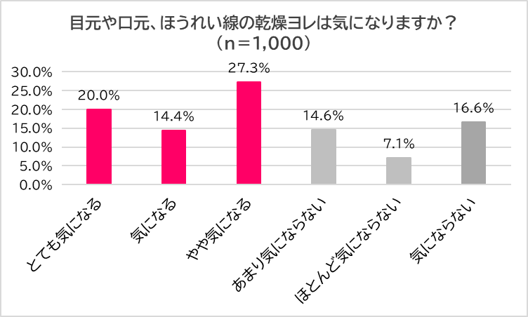 今度は、「目元や口元、ほうれい線の乾燥ヨレは気になるか?」尋ねました。「やや気になる」(27.3%)が最も多く、以下「とても気になる」(20.0%)、「気にならない」(16.6%)、「あまり気にならない」(14.6%)、「気なる」(14.4%)、「ほとんど気にならない」(7.1%)となり、6割超(61.7%)の女性が乾燥ヨレを気にしていることがわかりました。