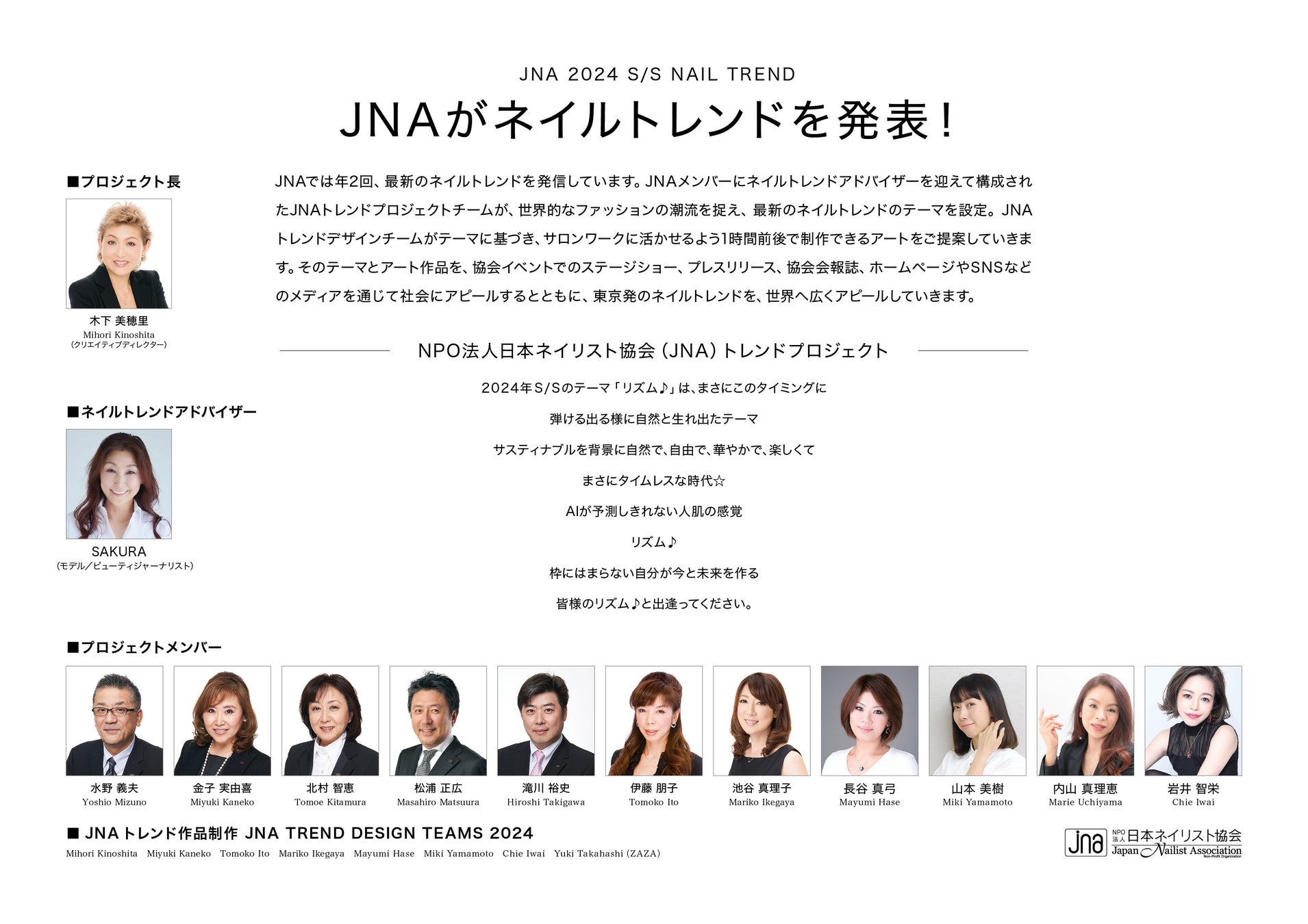 このネイルトレンドは、世界的なファッションの潮流なども踏まえ、「JNA ネイルトレンドプロジェクト(プロジェクト長 木下美穂里)」 が年2回設定し、発表しています。日本ネイリスト協会メンバーに、ネイルトレンドアドバイザーとしてモデル/ビューティジャーナリストSAKURAさんを迎え、熟考し作り上げたテーマを元に、JNAトレンドデザインチーム(JNA認定プロダクツ企業から選抜されたネイルブランドと一流ネイリスト)が、ネイルサロンのお客様に提供するアイディアとして、ネイル作品制作を担当しています。