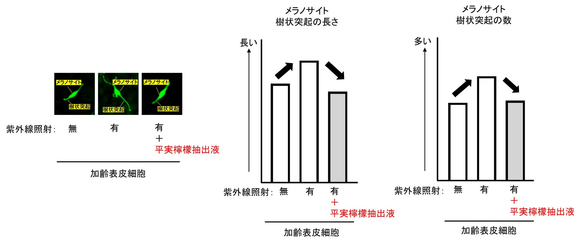 今回、紫外線によるシミの発生・悪化リスクが、加齢によるIL-6Rの発現促進を通して高まることが分かったことから、IL-6Rの発現を抑制する薬剤の探索を行いました。その結果、平実檸檬抽出液に表皮細胞のIL-6Rの発現を抑制する効果があることを発見しました(図5)。さらに、平実檸檬抽出液は、加齢表皮細胞とともに共培養したメラノサイトの樹状突起の長さと数が伸長・増加を抑制する効果があることを発見しました(図6)。IL-6Rの発現を抑制することで、加齢した肌でもシミの発生・悪化リスクを増大させない、新たなシミ予防アプローチの実現が可能になると考えられます。