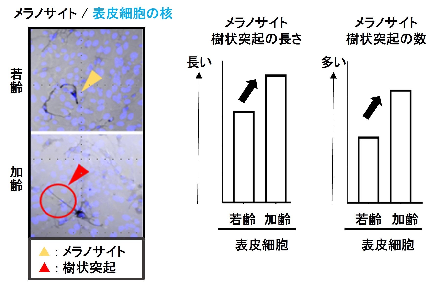 次に、シミ部位で増加していたIL-6Rの発現に影響を与える要因として、「加齢」について検証しました。若齢あるいは加齢のヒト由来表皮細胞を用いて実験したところ、日中の太陽光を想定した紫外線照射によって細胞中のIL-6Rの発現が、加齢した細胞においてより増加することが明らかになりました(図3)。また、IL-6Rが実際にメラノサイトの活性化に影響を与えるかを探るべく、加齢表皮細胞と共に培養したメラノサイトの状態を観察したところ、若齢表皮細胞と共に培養したメラノサイトと比べ、メラノサイトの活性化の指標である、樹状突起の長さと数が伸長・増加することが確認されました(図4)。表皮細胞のIL-6Rの増加はメラノサイトの活性化の引き金であり、「加齢」によって促される可能性があります。