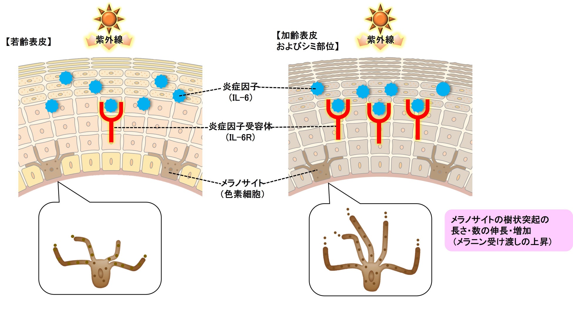 《加齢や紫外線による表皮細胞のIL-6Rの増加がメラノサイトの活性化につながる》