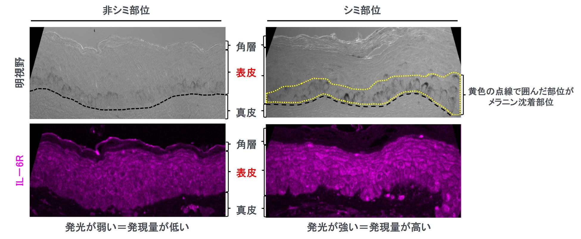 《シミのある皮ふでは、表皮細胞で炎症因子受容体IL-6Rの発現が増加》