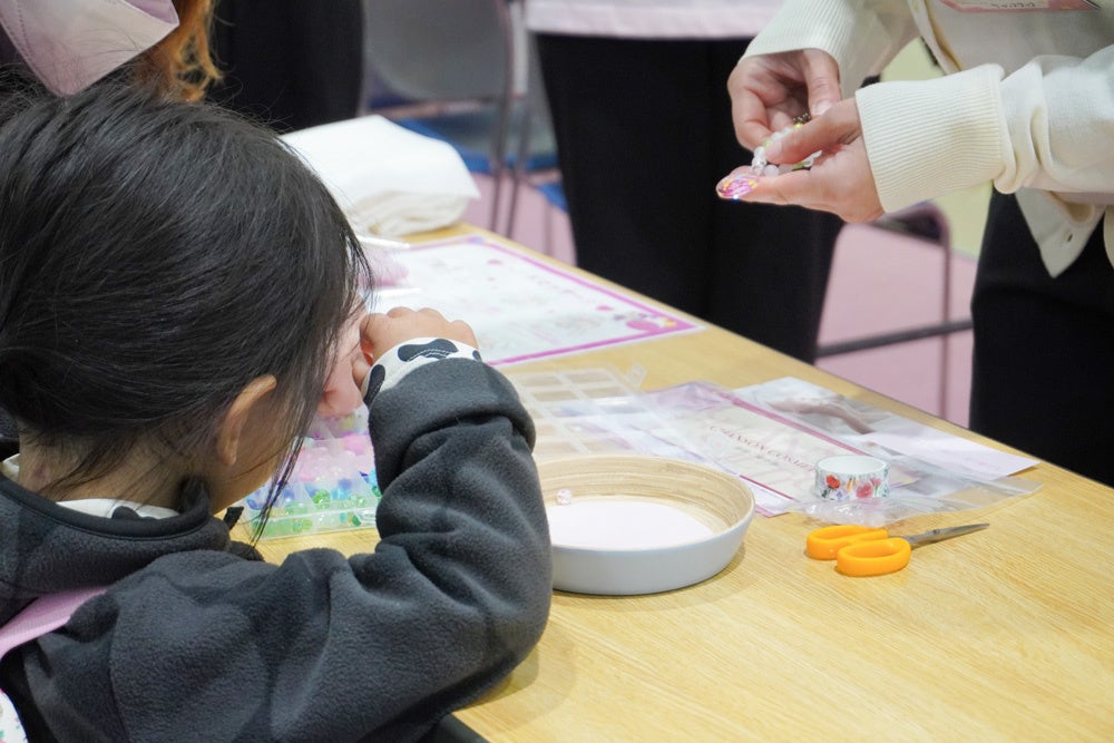 親子を対象に、現役のビューティーアドバイザーと一緒にUVアクセサリーづくりを体験していただきました。