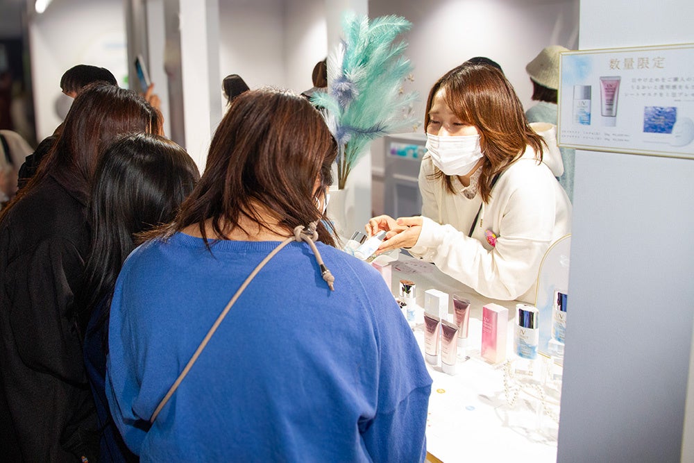メイクアップブースでは、美容インストラクターによるリップチェンジ体験や、2024年春の新商品をいち早くお試しいただけるセルフタッチアップ、地球にやさしいリサイクルコットンを使用したエコバッグの販売によるチャリティー活動などを実施しました。