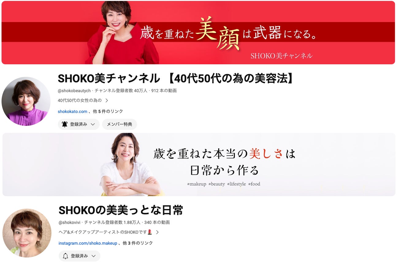「SHOKO美チャンネル」(登録者数40万人※1/15現在)は、現在54歳の現役ヘアメイクアップアーティストSHOKOが配信するYouTubeチャンネルで、40代50代の女性がキレイになることで自信を取り戻し、元気で笑顔あふれる高齢化社会実現のために、「40代50代だからこそ」の正しいお手入れや年齢に合わせた美容法を紹介しています。