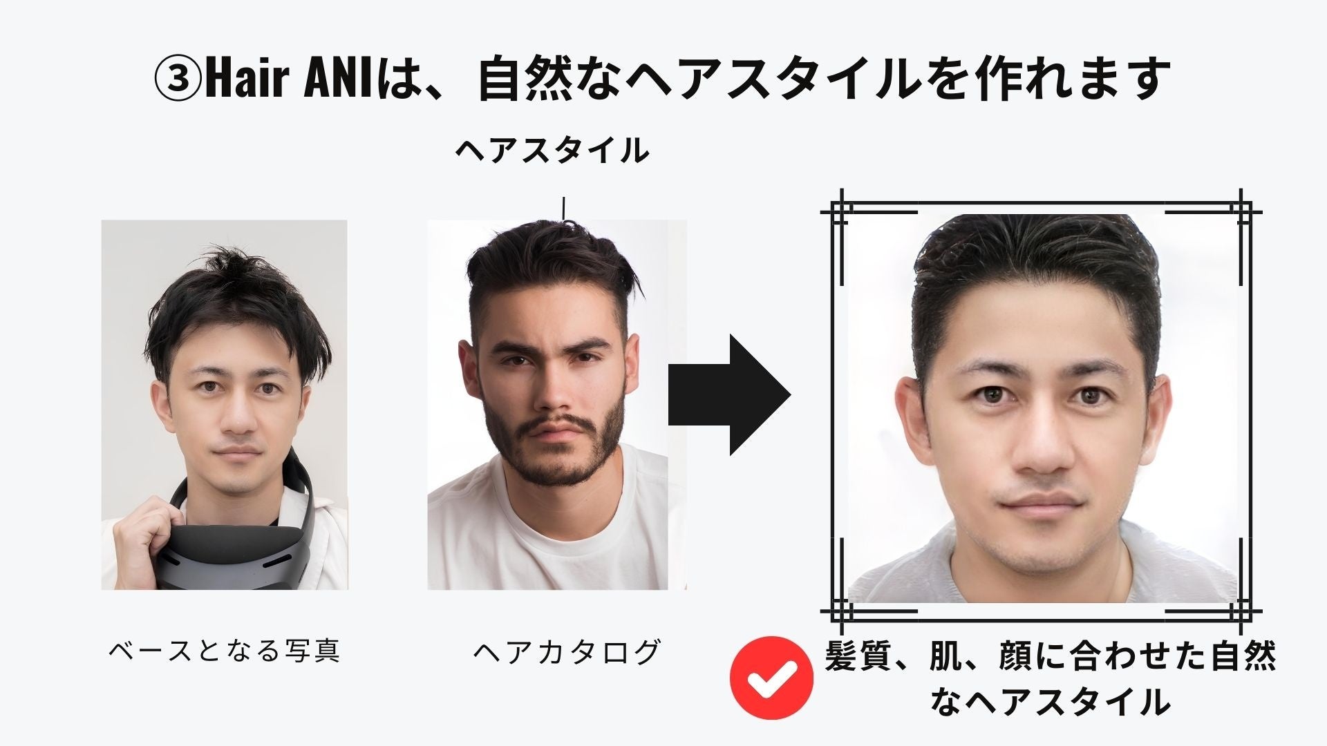 「HairANI」は、元の髪質からヘアスタイルを作る為、自然な髪質のヘアスタイルを作ることが可能です。