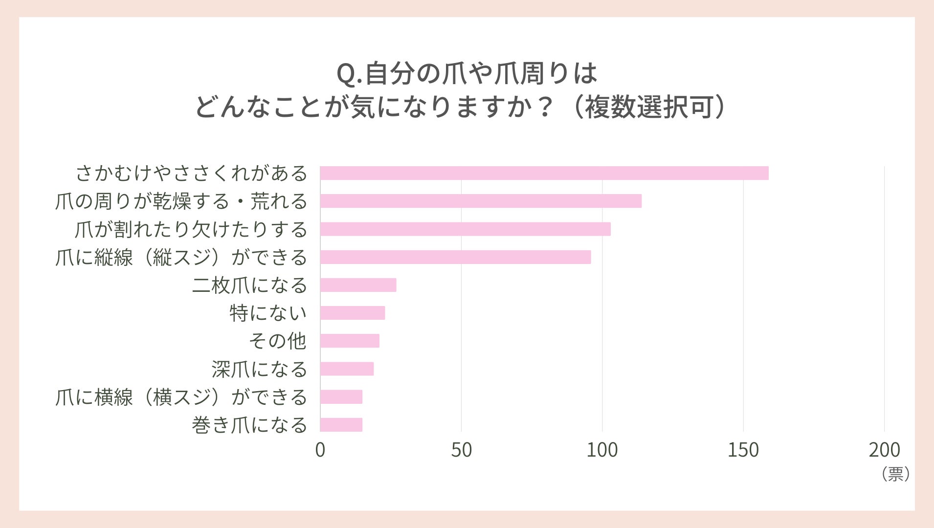 「自分の爪や爪の周りは、どんなことが気になりますか?」という質問をしたところ、もっとも票数が多かった回答は「さかむけやささくれがある」159票でした。