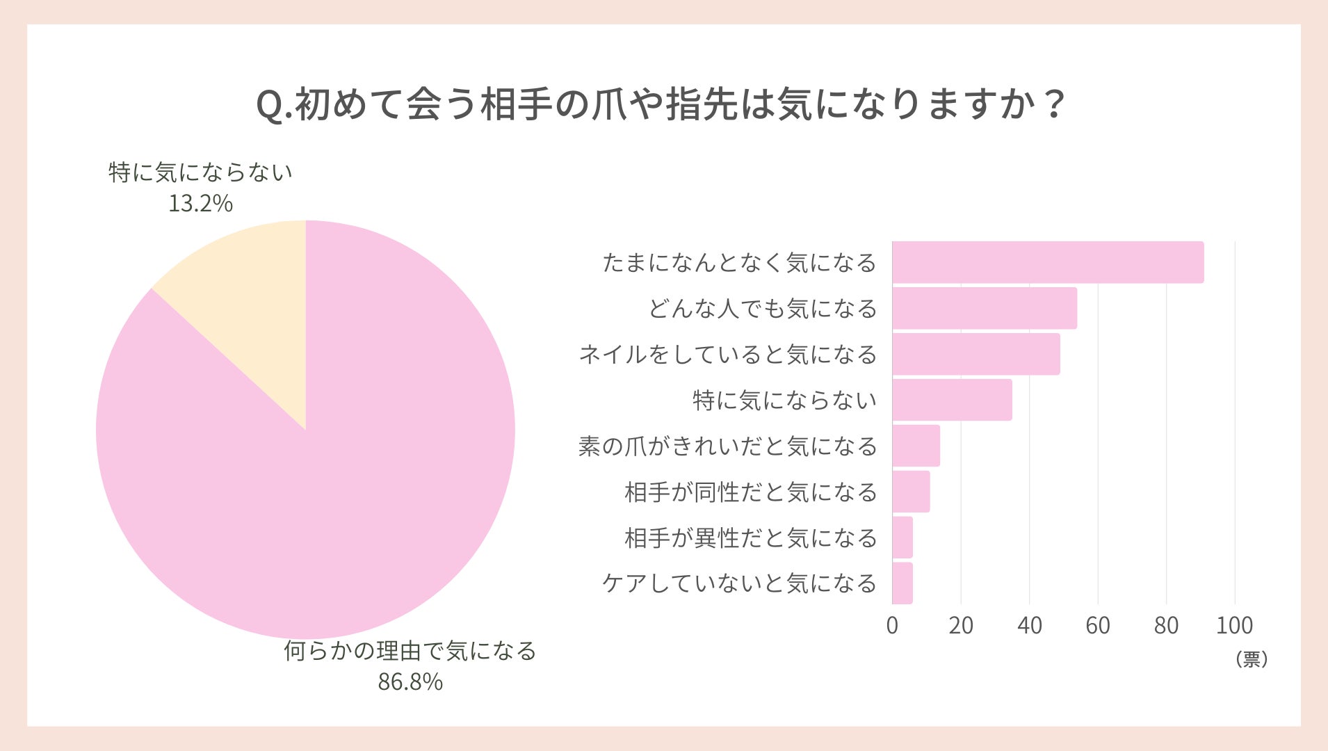 20~40代女性に実施したアンケートによると、何らかの理由で「初めて会う相手の爪や指先が気になる」と回答した女性は86.8%でした。