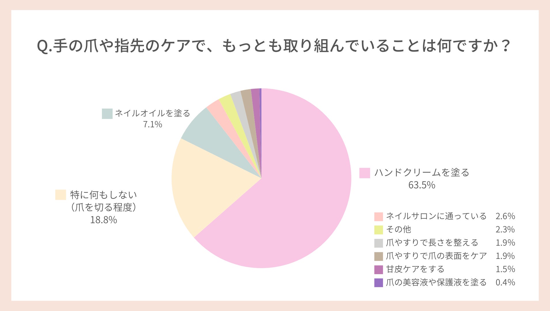 「もっとも取り組んでいる爪や指先のケアは何ですか?」というアンケートでも、「ハンドクリームを塗っている」と回答した女性は、半数以上の63.5%でした。