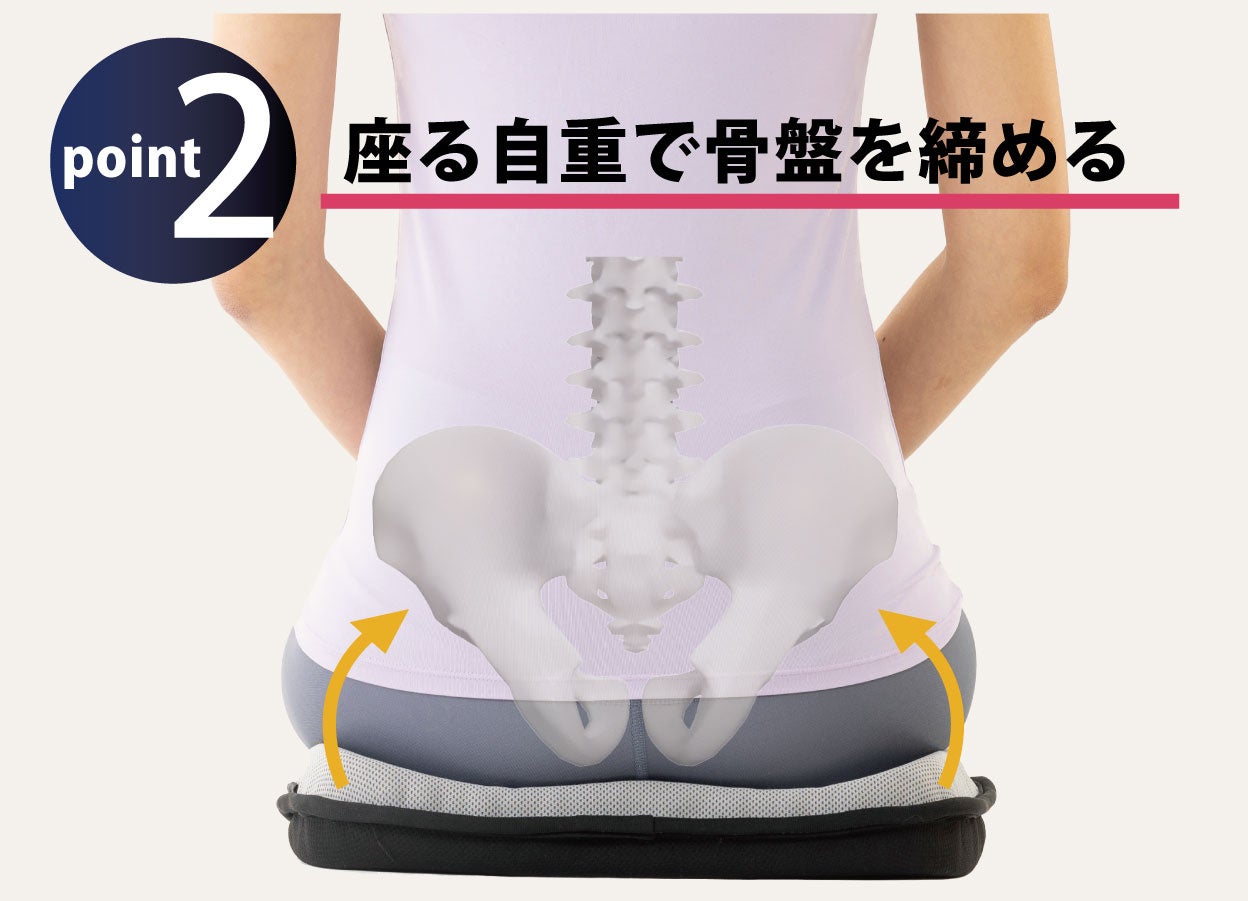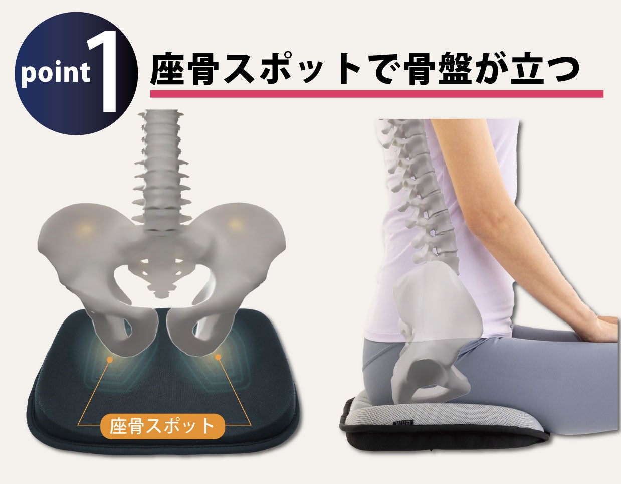 1. 本体後部に「座骨スポット」が設けられており、ただ座るだけで座骨をスポットに誘導し、自然と骨盤を正しい傾きに導いて安定させます。