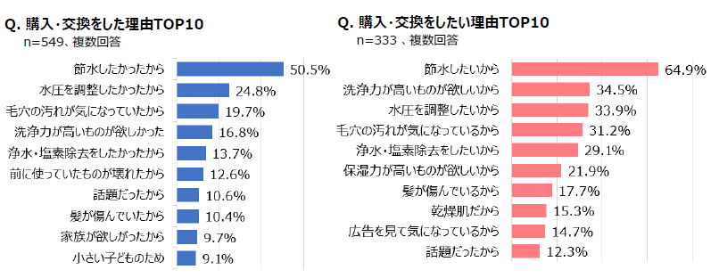 すでに購入・交換した人に、その理由を聞くと、1位「節水したかった」(50.5%)、2位「水圧を調整したかった」(24.8%)と、第一に節水機能を求めていたことが分かります。一方で、近々購入・交換したいと思っている人に、その理由を聞くと、1位は同じく「節水」(64.9%)ですが、2位には「洗浄力が高いものが欲しいから」(34.5%)がランクイン。また「毛穴の汚れが気になっているから」(31.2%)、「保湿力が高いものが欲しいから」(21.9%)など、美容面に関してさまざまな機能を要望する声も多くなっています。シャワーヘッドの付加価値的な美容機能は「マイクロナノバブルシャワーヘッド」の強みでもあります。すでに購入・交換した人のうち、「マイクロナノバブルシャワーヘッド」をセレクトした人は38.8%。シャワーヘッドへの要望がシンプルな「節水」から、「節水」+「美容」に変化している様子からも、「マイクロナノバブルシャワーヘッド」の普及は加速度が増しているようです。