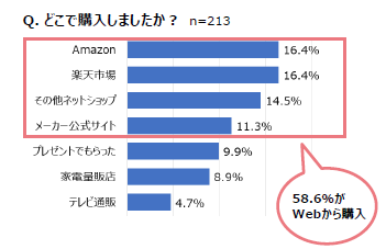 購入先を聞くと、 「Amazon」「楽天市場」「メーカー公式サイト」などWebで購入している人が58.6%で約6割。安くない買い物なだけに、価格変動が激しいWb通販で、お得なタイミングを見つけて上手に購入している様子がうかがえました。