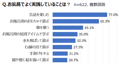 子どもと一緒のお風呂でよく実践していることを聞くと、「会話を楽しむ」が77・0%と一番多い結果になりました。家にいても家事などに追われ、何かと忙しいママにとって、「お風呂」は子どもと一緒に向き合って会話する大切な時間になっているようです。一方で、お風呂での悩み事を聞くと、多い順に「子どもがお風呂から出たがらない」(33.1%)、「お風呂から出たあと、なかなか服を着ない」(30.1%)、「子どもがお風呂に入りたがらない」(23.8%)という結果に。お風呂時間は楽しく過ごし、でもそのスタートとラストで悩みが多い…という実情が垣間見えました。