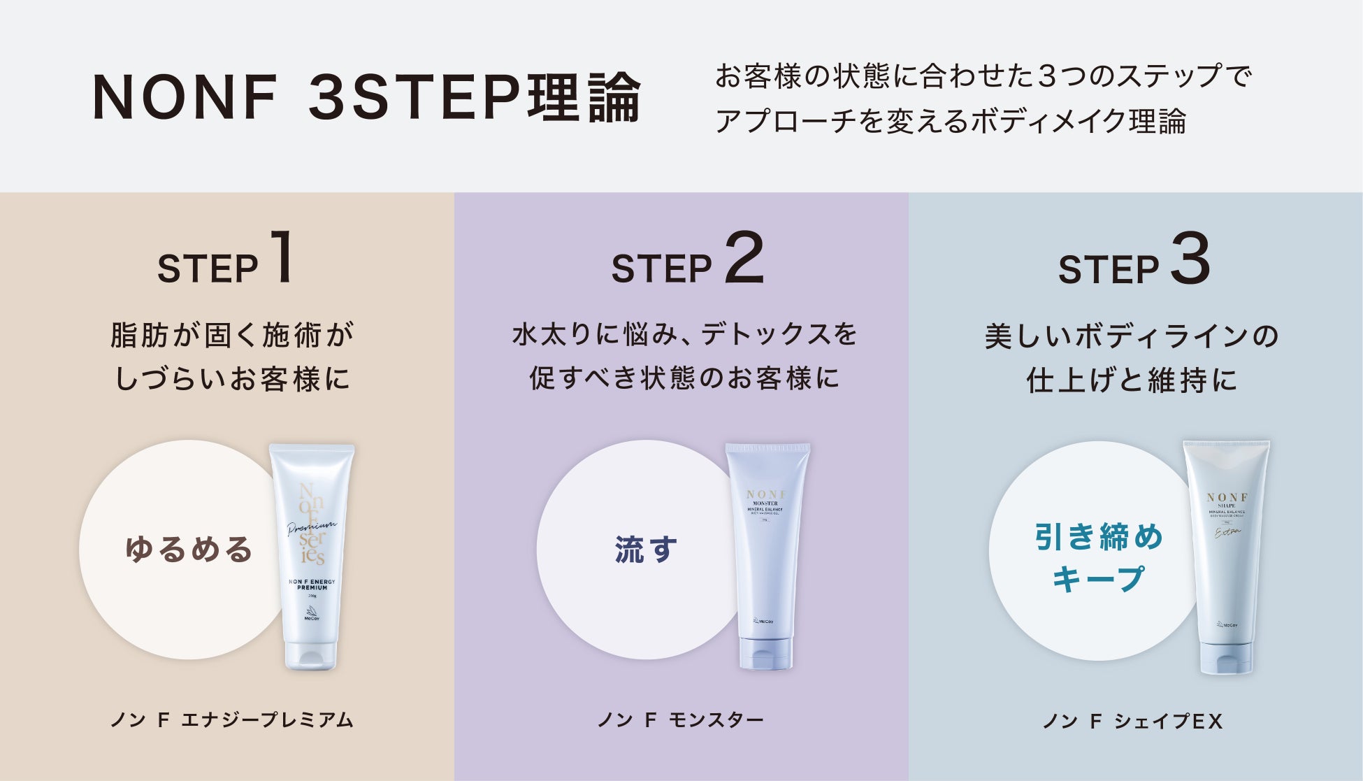 『NONF』では、美しく痩せる&維持するための道のりを段階ごとに定義し、お客様の状態に合わせた3つのステップ「①ゆるめる」「②流す」「③引き締め・キープ」を考案、実践するブランド独自のメソッド「NONF 3 STEP理論」を展開しています。