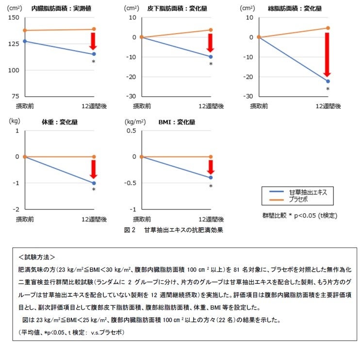 肥満気味の方(23㎏/m2≦BMI<30㎏/m2、腹部内臓脂肪面積100㎝2以上)を対象に、甘草抽出エキスを配合した製剤を摂取するグループと摂取しないグループの2グループに分かれて頂き、どちらかを12週間摂取した場合の腹部体脂肪面積等に及ぼす影響について評価しました。その結果、甘草抽出エキスを摂取したグループでは摂取前と比べて摂取後に腹部内臓脂肪面積の減少が確認されました。