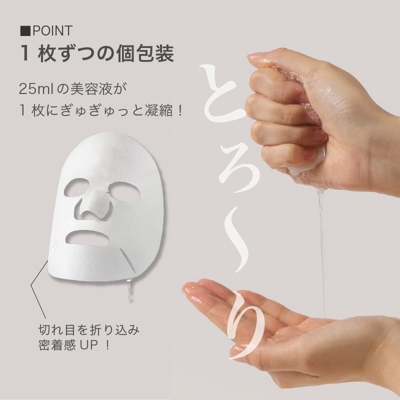 毎日頑張っているあなたにエステ時間を。厚生地のシートにたっぷり染み込んだ美容成分が、じっくりお肌の角質層まで浸透し、目覚めのお肌をハリと潤いに満ちた状態に導きます。ほんのり桃の香りに包まれ、リラックス&リフレッシュタイムをお楽しみください。家事や育児に忙しい主婦さんにも喜ばれるプレミアムなエイジングケア(※年齢に応じたお手入れのこと)シートマスクです。