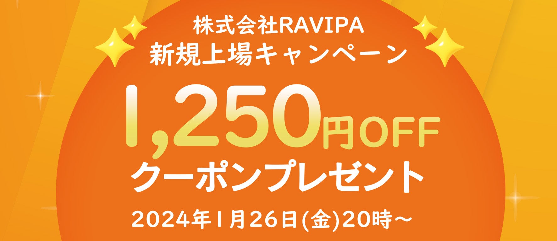 日頃より株式会社RAVIPAを応援してくださるお客様に感謝の気持ちを込めて、本日20時よりヤフー、楽天ぺージでご利用いただける1,250円OFFクーポンを配布いたします。