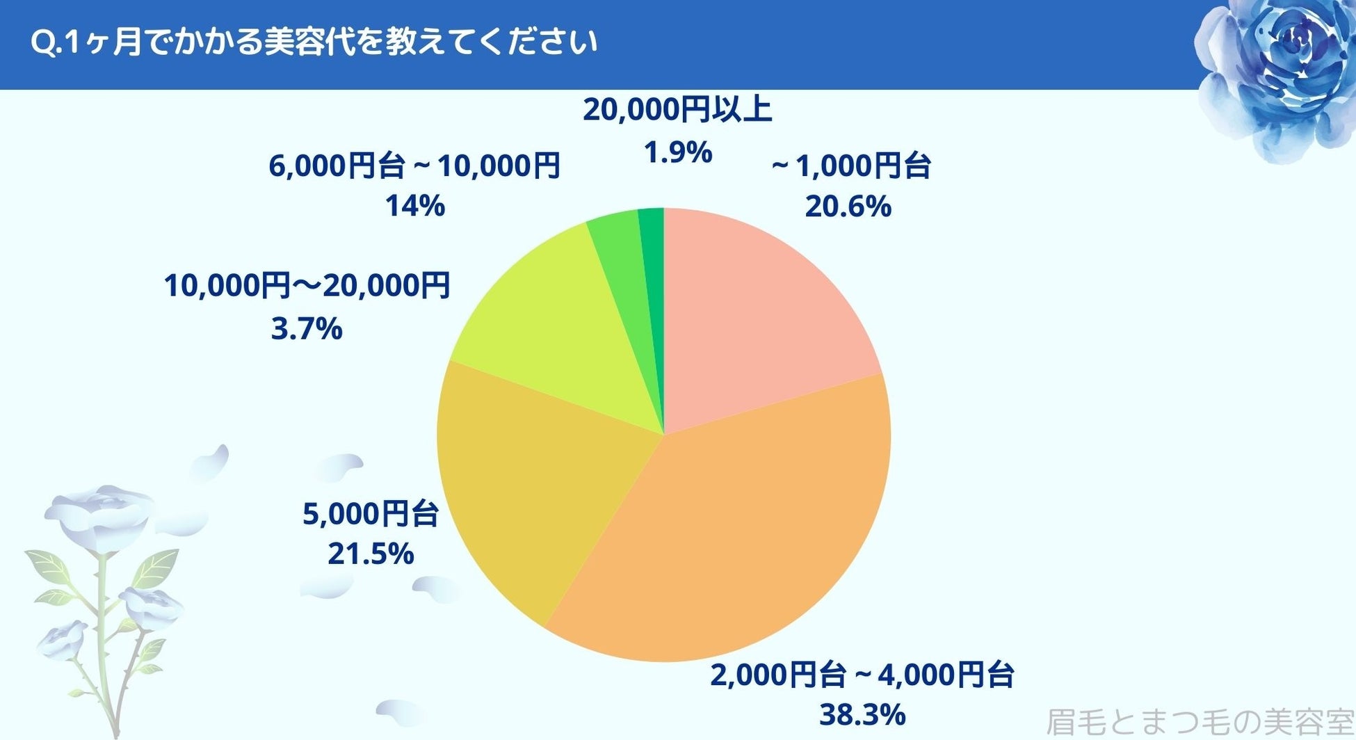 1ヶ月にかける美容代を調査したところ「~1,000円台(20.6%)」、「2,000円台~4,000円台(38.3%)」、「5,000円台(21.5%)」、「6,000円台~10,000円台(14%)」、「10,000円台~20,000円台(3.7%)」、「20,000円以上(1.9%)」という結果になりました。