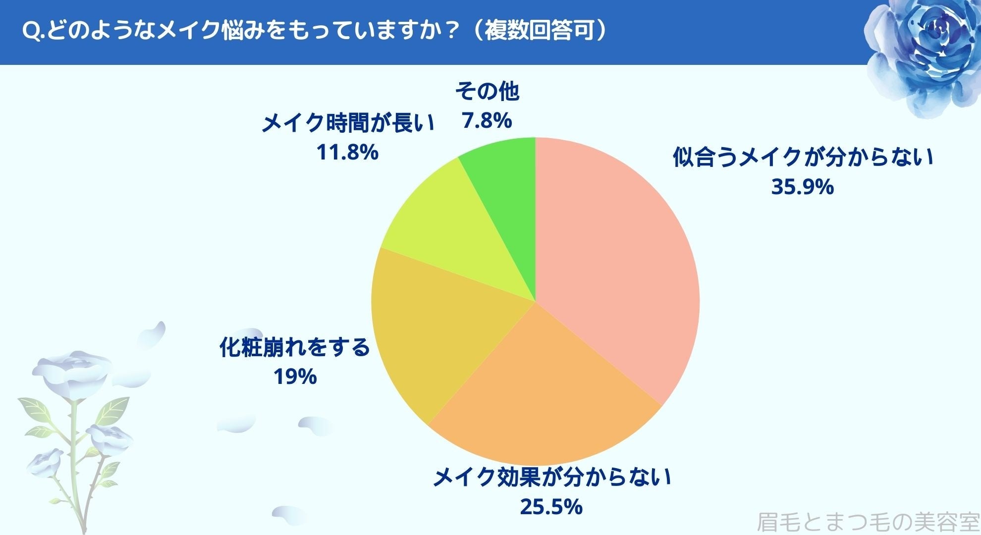 20代の女性にメイク悩みについてお聞きしたところ「似合うメイクが分からない(35.9%)」、「メイク効果が分からない(25.5%)」、「化粧崩れをする(19%)」、「メイク時間が長い(11.8%)」、「その他(7.8%)」という結果になりました。