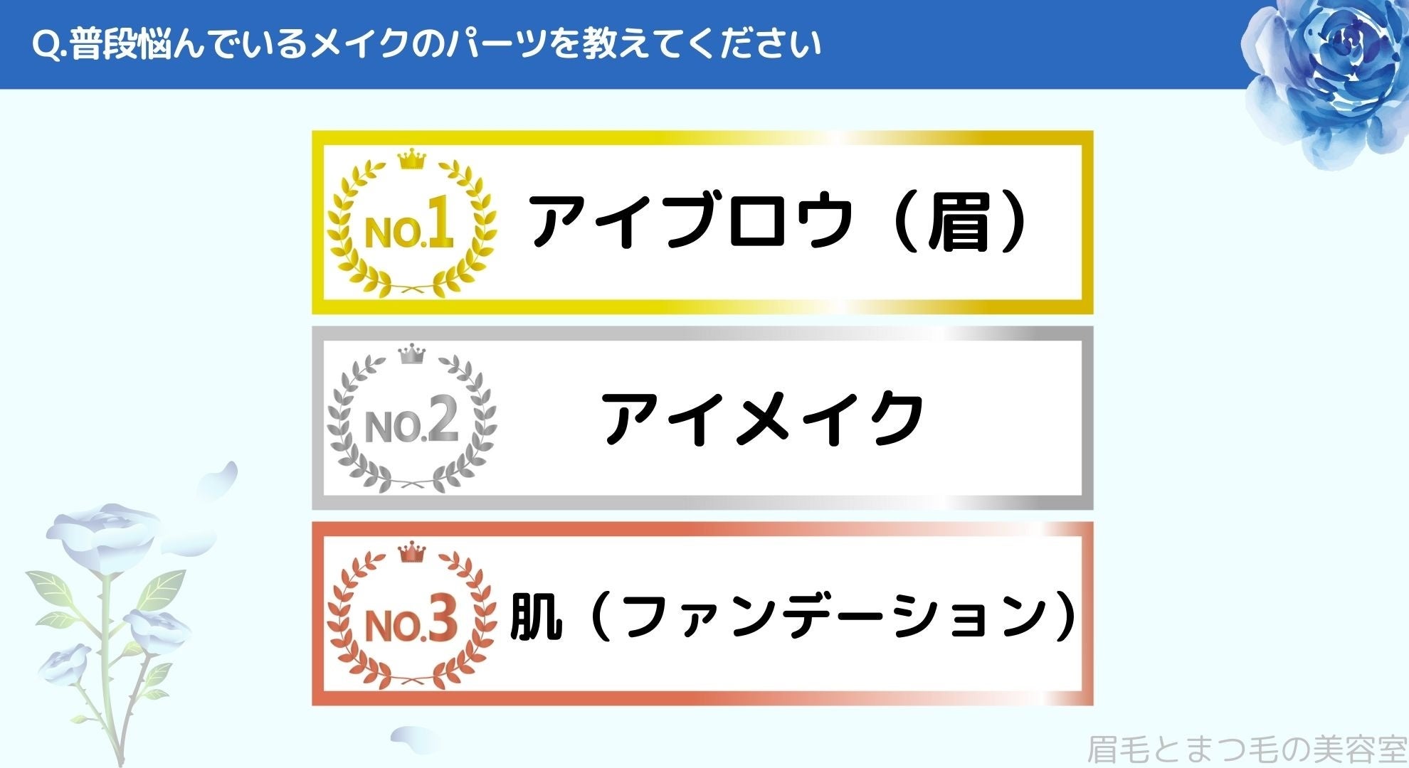 20代の女性に普段悩んでいるメイクのパーツをお聞きしたところ「1位>アイブロウ(眉)」、「2位>アイメイク」、「3位>肌(ファンデーション)」という結果になりました。